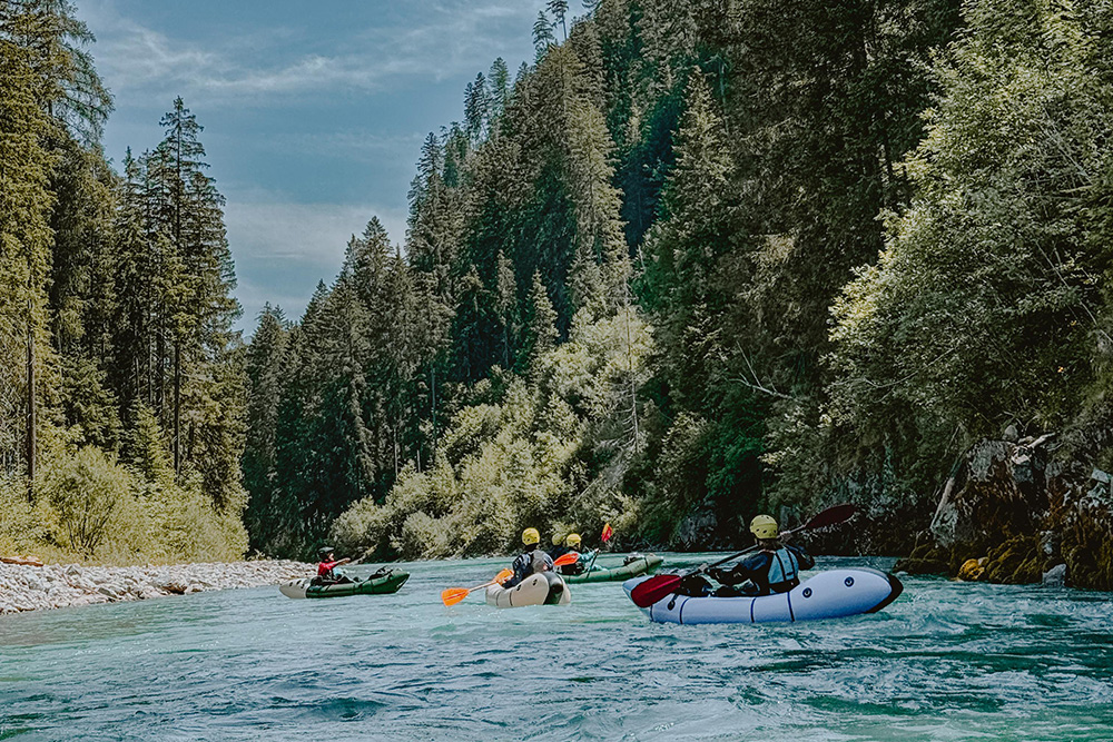 Eenmaal aangekomen bij het startpunt staat de kristalheldere rivier de Lech al op je te wachten. Geen tijd te verliezen dus. Je begint met deel 2 van de instructie, een praktische training waarin je van je instructeur de basisbeginselen van het packrafting leert: materiaalkennis, peddeltechniek, waterlezen, reddingstechniek enzovoort. Daarna vervolg je het packraftparcours samen met de groep en de instructeur.
